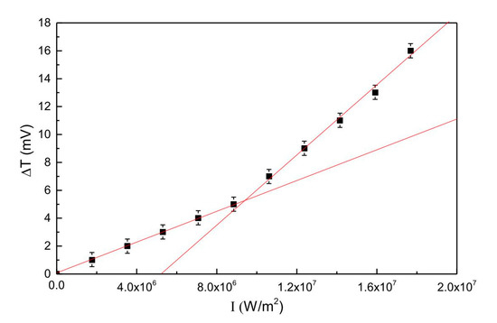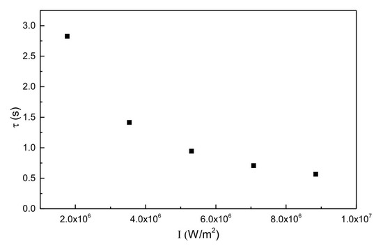 Photovoltaic time constants as function of the pump light intensity in the range (0–9 × 106) W/m2, i.e., in the range of intensities before the change of slope of the curve ΔT vs. I (see Figure 5).