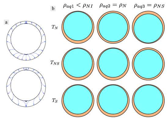 Schematic drawings of LC shell cross sections containing the main symmetry axis, typically running between the antipodal thinnest and thickest points. (a) In an asymmetric shell with tangential internal and normal external boundary, can take two types of hybrid configuration: with a convergent +1 defect at the thinnest point and a divergent +1 defect at the thickest point (top), or vice versa (bottom). (b) The expected equilibrium geometry, as viewed perpendicular to gravity, at temperatures near the N-isotropic transition (top), near the N-SmA transition (middle) and in the SmA phase (bottom), for an internal aqueous phase that is density matched to the LC in the isotropic state (left), in the nematic state (middle) and at the N-SmA transition (right), respectively. The LC phase is drawn in orange, the inner aqueous phase in cyan.
