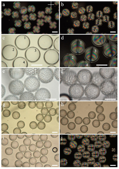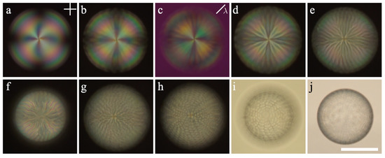 Polarizing microscopy photos of an LC shell, observed along gravity, with an inner droplet of ordinary water, with density lower than that of the LC throughout the N and SmA temperature ranges. The sequence is obtained on cooling from N to SmA, the latter being fully developed in (h–j). The focus is at the top of the shell except in (f,j), where the focus is at the bottom and equator, respectively. Photos (a–h) were obtained through crossed polarizers (orientation indicated in (a)), a -plate inserted in (c) with its slow axis as indicated, and photos (i,j) were obtained with a polarizer but not analyzer. Scale bar represents 100 m in the focal plane.
