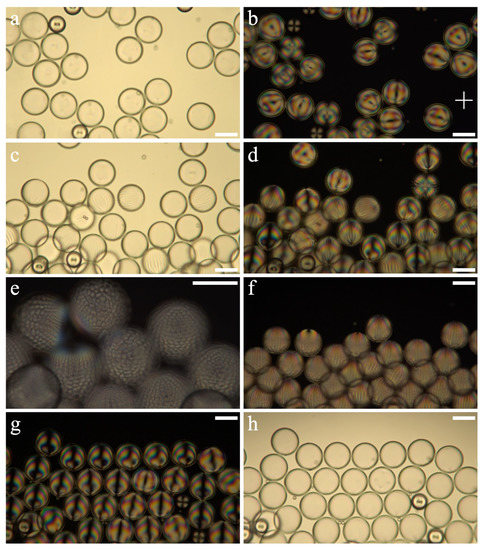 With an HO-based PVP solution as the inner aqueous phase, we have throughout the liquid crystal temperature range of the shell, rendering it thin at the top and thick at the bottom throughout the experiment. The +1 defect at the top is recognized in Figure 2a through the four brushes around the defect, which appears at the center of each shell. As noted and explained by Noh et al. for hybrid-aligned nematic shells [31], the brushes form a characteristic spiral pattern with weakly curved brushes around each defect at high temperature in the N phase (a), indicating a director field that twists from top to bottom to reduce the elastic deformation energy.