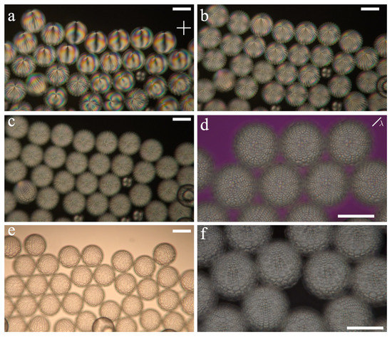 Polarizing microscopy photos of the same shells as in Figure 5 just after the microscope was brought back to upright orientation while the shells were in the nematic phase (a), where the LC and inner aqueous phase are density matched. Upon cooling into the SmA phase, the LC becomes denser than the inner aqueous phase and the shells thus reorient (or the inner droplet relocates within the shell) until the thinnest point faces upwards (b–d). The microscope has again been tilted 90 in (e,f), and we have waited until the shells have almost reoriented in response to the change in gravitational force direction (directed downward in these photos); hence, we see the shells from the side, with the thin top upwards and the thick bottom downward. Photo (e) was obtained without an analyzer, all others between crossed polarizers (indicated in a); photo (d) additionally has a -plate inserted, its slow axis oriented as indicated. Scale bar represents 100 m in the focal plane.
