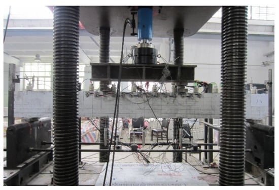The test apparatus and loading set-up of the beam specimens are shown in Figure 2 and Figure 3. All tests were conducted under four points with simply supported condition. The load was applied to the specimens under monotonic loading using a 2000 kN hydraulic servo testing machine, and equal magnitude loads were applied at the two loading points located at a distance of one third of the span length from either support.
