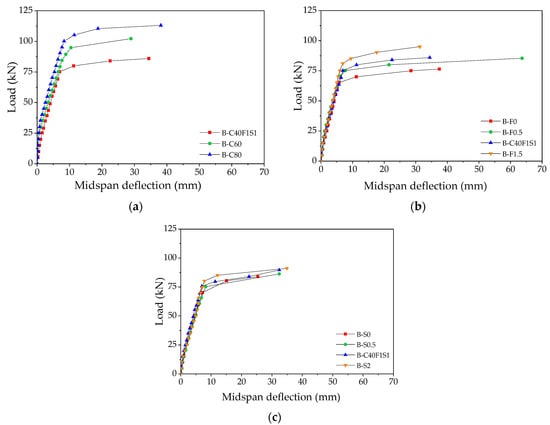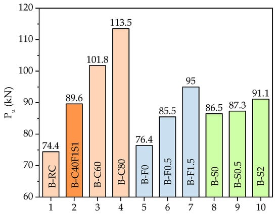 Compared to the B–S0 specimen, the ultimate loads of B–S0.5, B–C40F1S1, and B–S2 specimens were improved by 1%, 3%, and 5%, respectively. The results indicate that NS content had limited influence on the ultimate load.