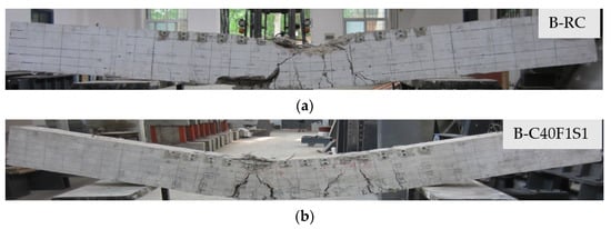 In addition, Figure 6b–d shows the effect of concrete strength on the failure mode of SFNMRC beams. In these beams, after the appearance of several initial cracks, with a small increase in the load, one of the cracks in the constant bending moment region quickly opened and developed to the extreme compression fibers of the concrete. This proved that increasing the concrete strength had a positive effect on the cracking performance of SFNMRC beams, which was the result of strain reduction in the tensile zone. In addition, compared to the B–C40F1S1 specimen, the maximum crack widths of beams B–C60 and B–C80 were decreased by 5% and 7%, respectively. This shows that increasing the concrete strength is an effective method to reduce the crack width of SFNMRC concrete specimens.