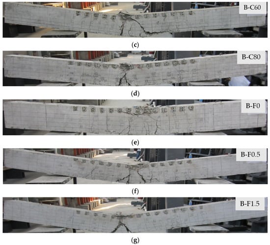 Bending failure process and failure modes: (a) B-RC; (b) B-C40F1S1; (c) B-C60; (d) B-C80; (e) B-F0; (f) B-F0.5; (g) B-F1.5.