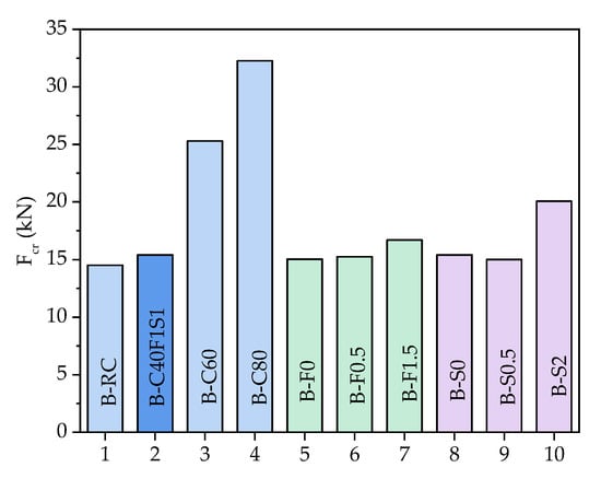Figure 7 shows the comparison of the cracking load (Fcr) for all the tested specimens. The cracking load of B–C60 and B–C80 specimens were improved by 64% and 109% with an increase in concrete strength from C40 to C60 and C40 to C80, in comparison to the B–C40F1S1 specimen. This indicates the positive effect of concrete strength on improving the cracking load in the beams.