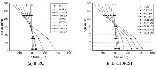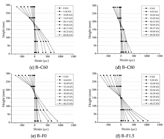 The strain of concrete along the height of the cross-section: (a) B–RC, (b) B–C40F1S1, (c) B–C60, (d) B–C80, (e) B–F0, (f) B–F1.5.