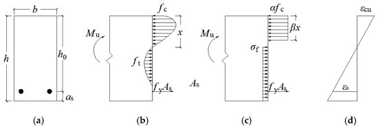 Stress and strain distributions of the strengthened beams under bending failure: (a) cross section; (b) stress distribution; (c) equivalent rectangular compressive stress distribution; (d) strain distribution.