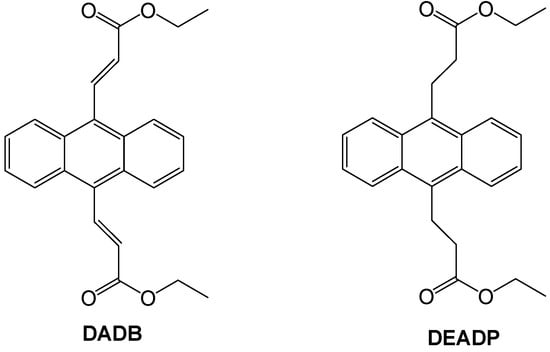 Chemical structure of anthracene derivatives diethyl-(2E,2′E)-3,3′-(anthracene-9,10-diyl)di(prop-2-enoate) (DADB) and diethyl-(2E,2′E)-3,3′-(anthracene-9,10-diyl)di(prop-2-enoate) (DEADP).