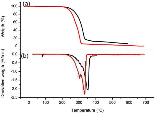 TGA (a) e DTG (b) analysis of DADB (–) and DEADP (–) in N2 atmosphere at rate heating of 10 °C min−1.