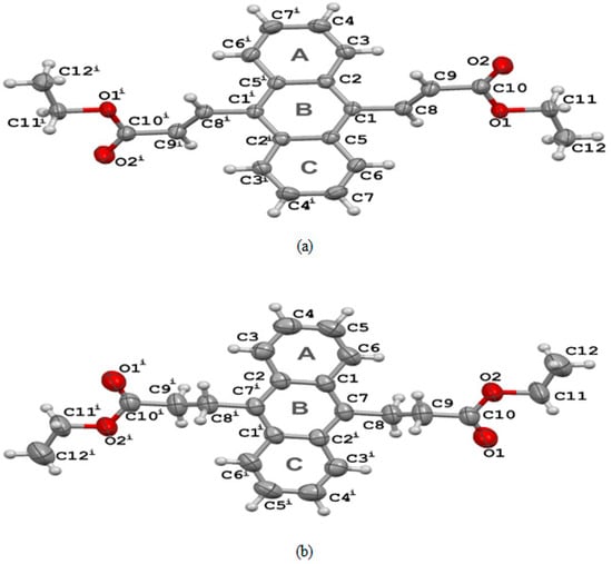 DADB is an anthracene analogue in which two acrylate groups are para-bonded to aromatic ring B. This compound crystallized in the monoclinic crystal system and space group P21/c. Its unit cell measures a = 13.0556(3) Å, b = 4.03270(10) Å, c = 18.0384(4) Å and = 90.7920(10)°. Besides crystallographic symmetry, DADB has molecular symmetry as an inversion center i above the gravity center of aromatic ring B. An Ortep diagram showing the atom displacement with 50% probability level and numbering scheme of DADB is presented in Figure 5a. DEADP is the result of the addition to the acrylate group, presenting two sp3 carbons bound to ring B. DEADP crystallized in the centrosymmetric space group C2/c, with eight asymmetric units (AU) in the unit cell and half molecular unit per UA. The ORTEP representation of DEADP is shown in Figure 5b, as well as the numbering scheme used in the structural description. The refinement indicated that DEADP has a dynamic disorder in O1, O2, C11 and C12 atoms in which the dominant conformation corresponds to 85%. The main crystallographic data are tabulated in Table 1.