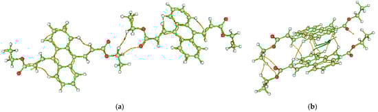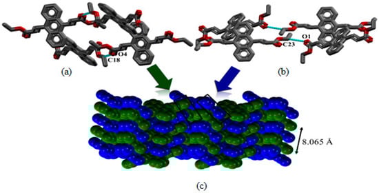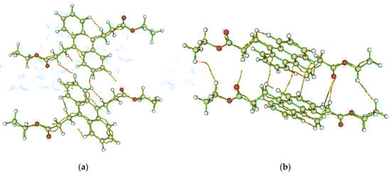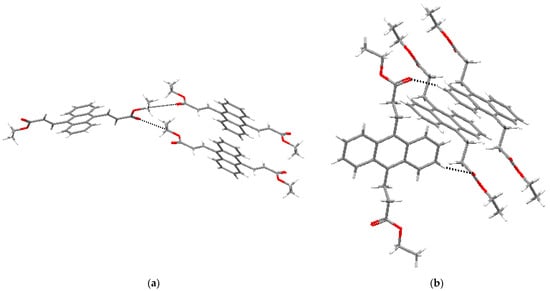 Similarly, the DEADP crystals are formed in two arrangements: the first in zig-zag and the second in layers (Figure 13b). In this case, the formation of the first arrangement occurs through the contact between the O atom of the carbonyl group with the H atom of the anthracene ring while the second also axially (Figure 13b). The theoretical calculation showed that the complexation energy of the frontal contact has an energy equal to −3.69 kcal·mol−1 while the axial contact resulted in an energy of −12.69 kcal·mol−1. The axial contact between DEADP molecules is justified by the large surface area, which is in contact with the crystals, resulting in an interaction 3.4 times greater compared to the frontal contact.