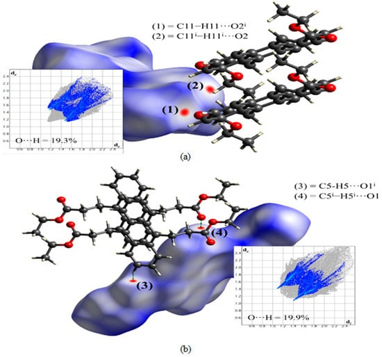 The supramolecular arrangements of DADB and DEADP were also evaluated from HS analysis. By combining (distance from the inner molecule to the surface) and de (distance from the outer molecule to the surface) in the function of their Van der Waals radii, it is possible to generate a surface named . This surface is based on a scale color ranging from blue (less intense) to red (more intense). In this sense, the weak intermolecular interactions of DADB are shown as red dots on the surface, as seen in Figure 7a. The 2D fingerprint plot of O···H contacts is also shown, indicating their percentage. Although interactions (1) and (2) present high intensity on surface, the fingerprint indicates and around 1.5 Å as weak interactions. On the other hand, interactions (3) and (4), represented in both the HS and fingerprint plots of Figure 7b, presented and around 1.4 Å for DEADP.