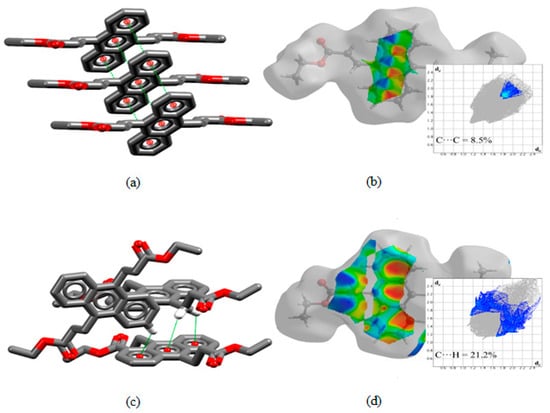 For DADB, the carbonyl group often assists in aggregation via two weak C–H O interactions. These interactions are responsible for assembling the acrylate groups as follows: the first one [C11–H11 ⋯ O2i; d(D-H) = 0.970 Å; d(D-A) = 3.137 Å; d(HA) = 2.777 Å; = 102.69°] gives rise to a 1D zigzag chain with C(13) motif, represented by the color green in Figure 6a. Then, the second one [C11i–H11i O2; same geometric parameters of C11–H11 O2i] forms a complementary 1D chain, also with C(13) motif that connects two green chains as a layer almost parallel to ( 0 3), represented by the color blue in Figure 6b,c. The crystal packing of DEADP is like that of DADB, since it is stabilized by two C–H O interactions. The first interaction [C5–H5 O1i; d (D-H) = 0.931 Å; d (D-A) = 3.541 Å; d (H⋯A) = 2.641 Å; ∡ = 162.74°] forms a chain along the c axis, while the second interaction [C5i–H5i O1; d (D-H) = 0.931 Å; d (D-A) = 3.541 Å; d (H⋯A) = 2.641 Å; ∡ = 162.74°] links these chains to form a layer parallel to (100).