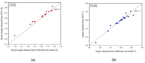 Comparison between the (a) bond lengths and (b) angles obtained using DFT method (M06-2X) and experimental result for DADB molecule.