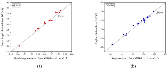 Comparison between the (a) bond lengths and (b) angles obtained using DFT method (M06-2X) and experimental result for DEADP molecule.