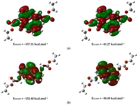Anthracene derivatives diethyl-(2E,2′E)-3,3′-(anthracene-9,10-diyl)di(prop-2-enoate) (DADB) and diethyl-(2E,2′E)-3,3′-(anthracene-9,10-diyl)di(prop-2-enoate) (DEADP) were synthesized by the methodology presented by Oliveira et al. [13,14]. Spectroscopic analysis by Fourier-Transform Infrared (FTIR). (PerkinElmer, Anápolis, GO, Brazil) was carried out in a Frontier Perkin Elmer equipment in the region of 400–4000 cm−1, recording by 14 scans of accumulations using KBr pellets (PerkinElmer, Anápolis, GO, Brazil).