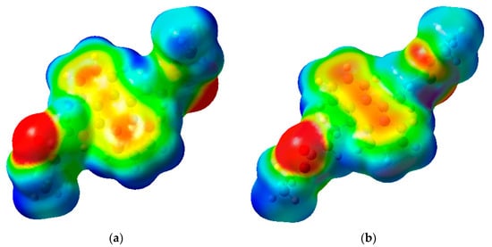 and the molecular electrostatic potentials (MEP) maps were obtained. In Equation (2), the variable is the charge on nuclei at point and is the charge density at point [26]. The first term represents the electrostatic potential created by the nucleus and the second term is created by the electrons as a function of the electronic density [27]. Electronic isodensity surfaces are applied in several areas of theoretical chemistry, playing an important role in understanding the intermolecular interactions of compounds, molecular properties, reactivity, crystalline packaging, solvation, drug action and its chemical analogues, and so on.