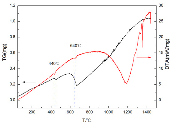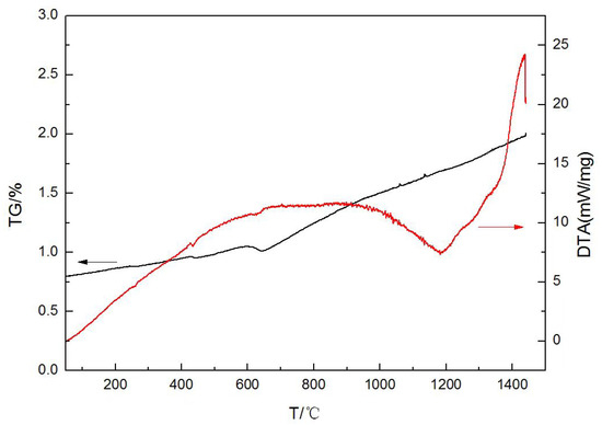 In order to determine the range of test temperature, the DTA/TG was performed on the steel slag. The DTA/TG curve from room temperature to 1450 °C is shown in Figure 1.