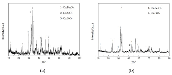 In order to determine the amount of CaO, Al2O3, and SiO2, the proportion of the components in the steel slag was calculated. The molar ratio of Ca, Al, and Si in gehlenite is 2:2:1. However, Ca cannot be completely converted into gehlenite in the actual reaction, so the ratio of Al2O3 and SiO2 should be increased appropriately. The mass ratio of CaO, Al2O3, and SiO2 was determined as 6:5:4. The element Ca in steel slag accounts for 51.87%, Si accounts for 7.67%, and Al only contains for 0.76%. The Ca2SiO4, Ca3SiO5, and Ca2Fe2O5 in the steel slag can provide CaO and SiO2 for the formation of gehlenite. However, the content of SiO2 and Al2O3 is obviously insufficient. The final ratio can be calculated by Formula (4).