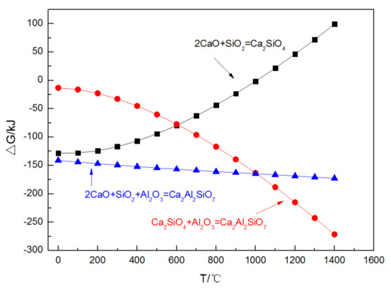 It can be seen from Figure 3 that when the temperature is below 1000 °C, the ΔG of Formula (2) is smaller than that of Formula (1); therefore, Formula (2) is the main way to generate gehlenite. When the temperature is beyond 1000 °C, the ΔG of Formula (1) is smaller; therefore, Formula (1) is the main way to generate gehlenite. The ΔG of Formula (3) shows an upward trend, exceeding 0 kJ at 1000 °C, indicating that Formula (3) is difficult to react beyond 1000 °C.