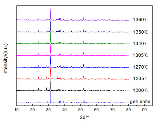- Gehlenite crystals are formed at 1200 °C, and the size gradually increases as the temperature rises; meanwhile, the sample becomes denser. When the sintering temperature increases to 1360 °C, the sample appears to melt, which is caused by over burning.