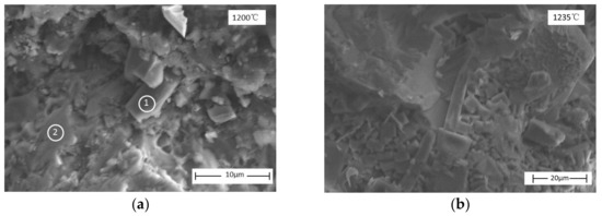 Figure 6 shows the SEM images of Al2O3–SiO2 sintering with steel slag at different temperatures. It can be seen from Figure 6a that there was only a small part of the cubic crystals growing and forming at 1200 °C, and the crystal grain size was small: the width is less than 5 μm. When the sintering temperature reached 1235 °C, the cubic crystal grains began to increase. After firing at 1270 °C, more cubic crystal grains appeared and the width of the particles gradually increased but irregular amorphous regions still existed. The width of the cubic crystal grains was mostly 20 μm. When the sintering temperature increased to 1305 °C, the grain boundary became fuzzy, which indicates local melting-recrystallization. With the increase of the sintering temperature to 1340–1350 °C, a number of cubic particles appeared and the particle size become large, indicating the amount and crystalline nature of gehlenite change. The gaps between the crystals of crystalline gehlenite reduced, and a staggered stacking structure appeared between crystals. The staggered packing of crystals increases the compressive strength of the sample [24]. When the temperature increased to 1360 °C, micro-melting appeared, and most of the edges of the crystals became unclear. It may be that, due to sintering at a higher temperature, the gehlenite crystal was over-burned. When over burning occurs, the main crystalline phase does not change, but the strength decreases [25].