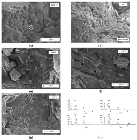 SEM observation of steel slag added with Al2O3–SiO2 system at different sintering temperatures (a–g) and the EDS spectrum of point 1 to 4 (h) in (a,c).