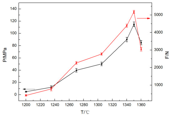 Figure 7 shows the compressive strength and bearing pressure of the modified steel slag after sintering at different temperatures. When the sintering temperature was 1200 °C, the sample was in a loose state, the maximum compressive force was 452 N, and the compressive strength was only 5 MPa. In tests it broke immediately and became powder. When the sintering temperature increased to 1270 °C, the sample was relatively dense; the maximum compressive force was 2715 N and the compressive strength reached 40 MPa. Meanwhile, the modified sample could be kept for a long time without deformation, which is more than the pure steel slag sample sintering at the same temperature. With the increase in the sintering temperature, the compressive strength and the maximum compressive force of the modified steel slag kept increasing. When the temperature reached 1340 °C, the compressive strength reached 90 MPa, which is close to the results of anorthite–cordierite-based binary ceramics. The excellent mechanical properties of modified steel slag appeared at 1350 °C. The maximum compressive force was 5182 N, and the compressive strength was 115 MPa. When the temperature increased to 1360 °C, the maximum pressure and compressive strength began to decrease. This may be due to the phenomenon of over burning which causes the grain boundary of the gehlenite crystal to change and melting to appear resulting in a reduction in compressive strength [27]. To compare the results, the compressive strength properties of other steel slag ceramics are shown in Table 2. This indicates that Al2O3–SiO2 has great potential in improving the mechanical proprieties of steel slag.