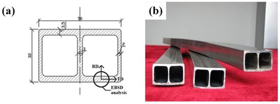 The material employed in the present work is Mg-8Gd-3Y alloy. There are two groups of initial billets used in this extrusion, which are as-cast billets and extruded bars. The as-cast billets with cylinder shapes of 100 mm diameter and 250 mm length are from continuous casting. The extruded bar with the same size was extruded by using a cast billet with diameter of 180 mm. Homogenization was performed before the extrusion process at 400 °C for 1h. Additionally, thereafter, the cast ingot billets and the extruded bars are used as the initial materials for extrusion of the square tubes with internal stiffener. Figure 1 shows the designed dimensions of the final extrusion tube. In addition, different cooling methods (air cooling and water cooling) and extruded temperature were utilized in the extrusion of the square tubes. In this study, the tube using cast ingot billets and air cooling is named CA, the tube using cast ingot billets and water cooling is named CW, the tube using extruded bars and air cooling is named EA and the tube using extruded bars and water cooling is named EW. Table 1 shows the samples with the according extrusion parameters. The appearance of the extruded tube is shown in Figure 1b. It can be seen that the appearance of these tubes is quite good, and the dimension is fit for the designed value.