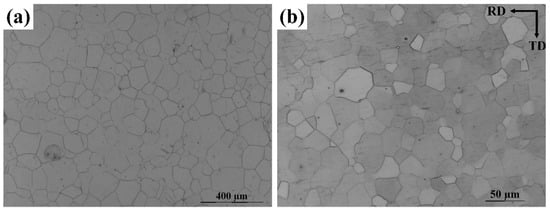 The microstructures of initial billets are shown in Figure 2 and show homogeneous distribution in grain size, but the cast ingot billet shows a big grain size about 200 μm and the extruded bar shows a fine grain size about 25 μm.