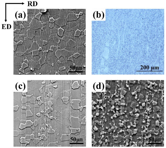 Microstructures of the extruded tubes in four extrusion process are shown in Figure 3. Fully recrystallized grains can be found in most tubes except the CW tube. A large fraction of unrecrystallized grains is shown in the CW tube with different morphologies. Some grains are formed in long strips and some are formed in a square shape with a large grain size. This indicates that the extrusion process is not homogeneous at the grain size level. Distribution of grains with different grain size can also be seen in the EA and EW tubes (Figure 3c,d) but these grains are all recrystallized grains due to the fine grain size of the initial extrusion billets.