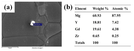 In addition, a few small cuboidal particles with a mean size of about 1–2 μm can be observed along the extrusion direction (ED) (Figure 4a) and the composition of the particle detected by EDS is shown in Figure 4b. It is a kind of typical particle precipitated during the extrusion process in Mg-Gd-Y alloys and the total volume fraction of particles is quite small in each tube.