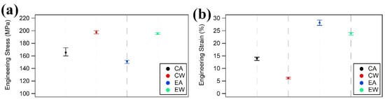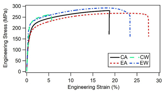Stress–strain curves of all tubes are shown in Figure 5 and comparisons of yield stress and elongation are shown in Figure 6. CW and EW tubes using water cooling show higher yield stress than tubes using air cooling. This is due to the fine grain size in CW and EW tubes.
