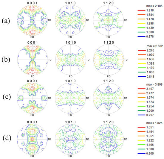 Texture will be weakened with RE addition [20,21,22], but the texture is still dependent on the processing parameters [23]. Firstly, deformation temperature is an important factor for the weakening of texture. The dynamic strain-aging (DSA) effect in a narrow window of temperature was proposed by Jiang [23], which indicated that the formation of RE texture components is enhanced by extruding under DSA conditions. This range depends on the type of solute and its concentration, as well as on the combination of extrusion temperature and mean strain rate employed. In this study, the extrusion temperature is selected at 400 °C, which falls in the window of DSA.