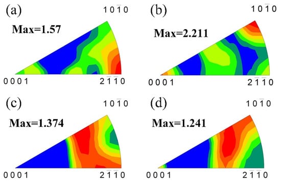 Secondly, the cooling rate after deformation would have a significant effect on the formation of texture. Without rapid cooling, a process of static annealing would go through with the residual heat after extrusion. According to previous studies, the process of preferred grain growth is discovered by Wu [16]: in the Mg-1Gd alloy, a gradual strengthening of the <2-1-11> RE-texture component at the expense of the <10-10> component during the recrystallization annealing process. Additionally, the driving force for the preferred grain growth is the difference in stored energy between the <2-1-11> grains and the <10-10> grains. While in the AZ31 alloy, the <2-1-10> component prefers to grow during the recrystallization process. Additionally, the preferred grain growth would be inhibited by the water-cooling method.