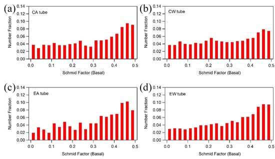 Schmid factor of basal slip system in (a) CA tube and (b) CW tube; (c) EA tube and (d) EW tube.