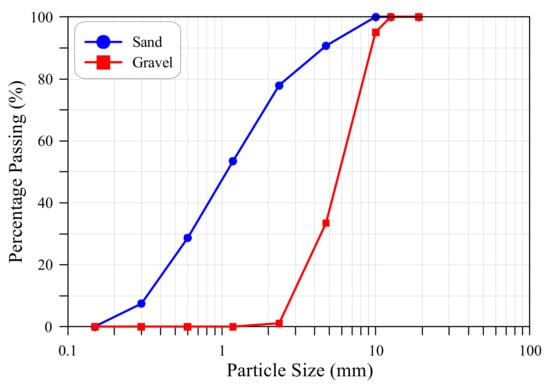 As stated previously, the experimental work presented in this study was conducted to be a reference work for future works where the post-fire residual impact performance of fibrous concretes will be assessed. Therefore, a normal plain concrete mixture was adopted in this study to investigate the effect of repeated low-velocity impacts on heated concrete. A cement content of 410 kg/m3 was used with 215 kg/m3 of water, while the fine and coarse aggregate contents were 787 and 848 kg/m3, respectively. Local crushed gravel and river sand from Wasit Province, Iraq, were used as coarse and fine aggregates. The maximum size of the crushed gravel was 10 mm. The chemical composition and physical properties of the used cement are listed in Table 1, while the gradings of both the sand and gravel are shown in Figure 1. All specimens were cured for 28 days in temperature-controlled water tanks.