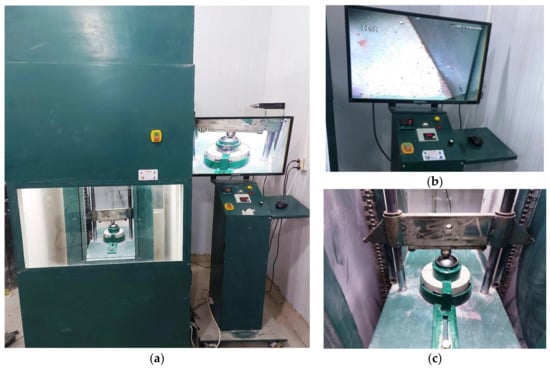 The impact tests were conducted using the standard ACI 544-2R repeated impact procedure. However, instead of the manual operation of the test, an automatic impact machine was built for this purpose and used in this study to perform the repeated impact tests. The impact machine shown in Figure 2a was built to reduce the efforts and time of the test, where repeated impacts were automatically applied using the standard ACI 544-2R drop weight (4.54 kg) and drop height (457 mm), while the crack initiation and failure were observed using a high-resolution camera, as shown in Figure 2b. The same standard test setup was followed, where a steel ball was placed on the top of the 150 mm-diameter and 64 mm-thick disc specimen, while the drop weight fell directly on the steel ball that transferred it to the center of the specimen’s top surface, as shown in Figure 2c. Once the first surface crack appeared, the number of repeated impacts was recorded, which is termed as the cracking number (Ncr). After, the impact was continued until the failure of the specimens, where the failure number (Nf) was recorded.