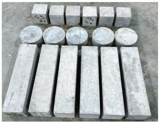In addition to the six impact disc specimens, six 100 mm cube specimens and six 100 × 100 × 400 mm prisms were cast from the same concrete patches, as shown in Figure 3. The concrete cubes were used to evaluate the compressive strength, while the prisms were used to evaluate the modulus of rupture. Previous researchers [36] showed that increasing the size of the cube specimen from 100 to 150 mm had no significant effect on the residual compressive strength after exposure to temperatures up to 1200 °C, while others [37] drew a similar conclusion for concrete cylinders having different sizes (diameter × length) of 50 × 100 mm, 100 × 200 mm and 150 × 300 mm. The cylinders were exposed to temperatures up to 800 °C. Several previous studies [38,39,40,41,42,43,44,45,46] adopted 100 mm cubes to evaluate the residual compressive strength of concrete.