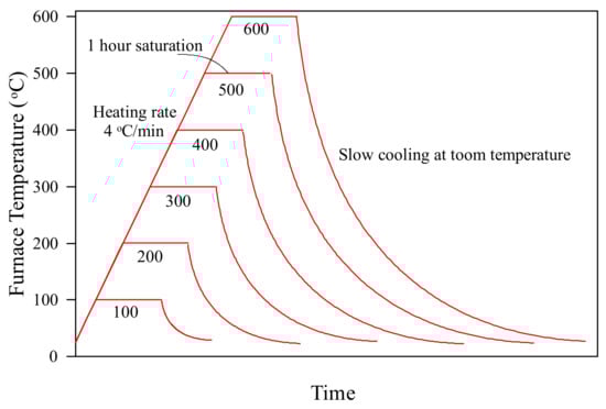Seven concrete patches were cast and cured in water tanks under the same conditions for 28 days, after which the specimens were left to air dry for a few hours and then dried in an electrical oven at 100 °C for 24 hours [15,47,48,49,50]. After the specimens were naturally air cooled, six of the seven patches were heated to temperatures of 100, 200, 300, 400, 500 and 600 °C using the electrical furnace shown in Figure 4a, while the seventh patch was left as an unheated reference. As shown in Figure 4b, a steel cage was used to reduce the destructive effects of the concrete explosive failure on the internal walls and heaters of the furnace. The heating process followed the heating and cooling procedure shown in Figure 5, where the specimens where heated steadily at a heating rate of approximately 4 °C/min until the target temperature. After, the specimens were thermally saturated at this temperature for one hour to assure the thermal steady state condition [51,52]. Finally, the furnace door was opened to allow for the natural air cooling of the specimens, which were left in the laboratory environment and tested the next day.