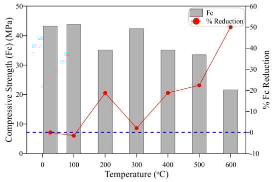 The residual compressive strength values after exposure to 100, 200, 300, 400, 500 and 600 °C in addition to those at ambient temperature are shown in Figure 6. The figure also shows the percentage reduction in strength due to temperature exposure. It is obvious that a slight strength gain of approximately 1.5% was recorded at 100 °C, where the compressive strength after exposure to this temperature was 43.9 MPa, which is higher than that before heating (43.2 MPa). This initial strength gain was reported by previous researchers [25] and is attributed to the increase in the material density due to the evaporation of free pore water and the increase in hydration products owing to the accelerated pozzolanic reaction [72,73]. The strength gain is represented as a negative percentage reduction in Figure 6. After exposure to 200 °C, the compressive strength recorded 35.1 MPa, with a percentage reduction of approximately 18.8%, while a noticeable percentage strength recovery was recorded at 300 °C. The residual compressive strength at 300 °C was 42.3 MPa, and the percentage reduction was only approximately 2.1%. Hence, more than 16% of strength recovery was gained as the temperature was increased from 200 to 300 °C. As the temperature increased beyond 200 °C, the removal of water from the surfaces of the cement gel particles induced higher attraction surface forces (van der Waals forces), which might increase the ability of the microstructure to absorb higher compression stresses [18,73]. Beyond 300 °C, the compressive strength exhibited a continuous decrease in strength, with an increase in temperature, where the percentage strength reductions were 18.8, 22.4 and 50.0% after exposure to 400, 500 and 600 °C. The significant strength drop after 500 °C is attributed to the volume changes that took place due to the shrinkage of the cement paste and expansion of the aggregate particles, which deteriorate the bond between the two materials [25,74,75]. The dehydration of cement and decomposition of calcium hydroxide also lead to destructive effects [76,77].