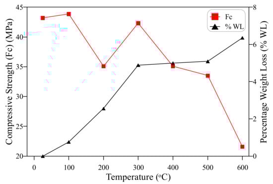 Figure 7 shows the relationship between the compressive strength and percentage weight loss of the same cube specimens after exposure to high temperatures of 100 to 600 °C. The percentage weight loss was calculated by dividing the weight loss (weight before heating-weight after heating) by the original specimen weight before heating, with the result multiplied by 100. The figure shows that three stages can be recognized in the percentage weight loss relation with temperature. In the first stage, the slope of the percentage weight loss was high after exposure to the sub-high temperature range (100 to 300 °C), which indicates early high weight loss. This weight loss can be attributed to the evaporation of the free pore water before 200 °C and the absorbed water in the cement gel particles. The second stage, which is a semi-stabilization stage with a very small positive slope, is related to the strength recovery and low reduction between 300 and 500 °C, where the microstructure is still not very affected by the chemical and physical changes due to temperature exposure. Finally, the weight loss starts another high-slope reduction region after 500 °C, where the cement matrix was cracked owing to the chemical changes, and the bond between the cement and aggregate was almost lost due to the different thermal movements [78,79]. Excluding the initial strength gain at 100 °C and the strength recovery at 300 °C, it can be said that the strength loss can be related to the loss in weight. The differences between strength loss and weight loss at these regions are attributed to the different behaviors of concrete under the different applied stresses, where it is stated that the residual tensile strength of concrete, for example, has a different behavior with temperature than that of the compressive strength. As weight loss is a stress-free measurement, there would be some expected differences with load tests.