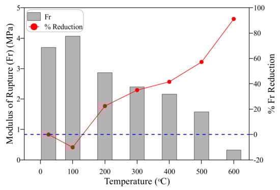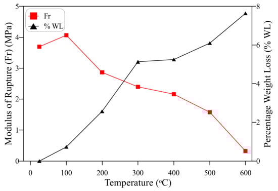 The weight loss for the same prisms was recorded, from which the percentage weight loss was calculated, which is depicted in Figure 9 against the residual modulus of rupture. The figure shows that a similar three-stage behavior can be recognized for the prism specimens to that recorded for the cube specimens, where the slope of the percentage weight loss was higher before 300 °C and beyond 500 °C, while it was lower between them. Similarly, excluding the high residual flexural strength recorded at 100 °C, the strength reduction curve exhibited a similar three-slope behavior to that of weight loss, where the percentage reduction slope was high from 100 to 300 °C and from 500 to 600 °C, while it was semi-stabilized between 300 and 400 °C for both the flexural strength and weight loss, as shown in Figure 9. This similar trend confirms the strong relation between weight loss and strength reduction after high temperature exposure.