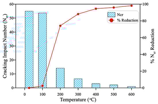 The strength of the material to resist impact forces dropped sharply after exposure to 200 °C, where the loss in impact resistance in terms of Ncr and Nf reached 74.2 and 73.5%, respectively. This reduction is dramatic and is much higher than the losses in the compressive, flexural and tensile strengths according to the literature and the current study results, where previous studies showed that the normal compressive strength range of normal concrete after exposure to 200 °C falls between 70 and 110% of the unheated strength [18,21,72]. Similarly, it is widely addressed in the literature that the modulus of elasticity of normal concrete would be higher than 70% of the unheated values [73,74,75]. Phan and Carino [25] reported that, for the case of an unstressed residual compressive strength test, which was the heating procedure followed in this research, an initial strength gain or minor loss is the usual trend of normal concrete up to 200 °C. The residual impact strength of the higher temperatures followed the same excessive strength drop, as shown in Figure 10 and Figure 11. The residual cracking impact strength after exposure to 300, 400, 500 and 600 °C was, respectively, 11.8, 5.5, 3.9 and 1.8% of the original unheated strength. Similarly, the residual failure impact strengths were 13.1, 7.0, 5.2 and 3.8% after exposure to 300, 400, 500 and 600 °C, respectively. Two points should be discussed here, namely, the strength reduction behavior with temperature, and the high drop in strength. It is obvious that the impact strength follows a similar trend of reduction with temperature to the flexural strength, where both the flexural and impact strengths showed stable responses at 100 °C, followed by a continuous decrease until the approximate fading of the strength at 600 °C. This might be attributed to the type of stresses caused by the repeated impacts on the concrete, where the received impact forces tend to cause a fracture surface and then transfer this into tensile stresses that try to open the cracks until breakage failure. The higher strength reduction can also be attributed to the nature of the impact loads, where a sudden concentrated loading is induced within a very short time, leading to a higher stress concentration and hence a faster deterioration. As soon as the microstructure is internally fractured by the initiation of microcracks, only a few further concentrated drops are required to induce the surface cracking and failure of the specimen. Since the microstructure of the cement paste, the aggregate particles and the bond between them are negatively affected by the preceding heating phase of the specimens, a quick fracture of these specimens is expected under impact drops.