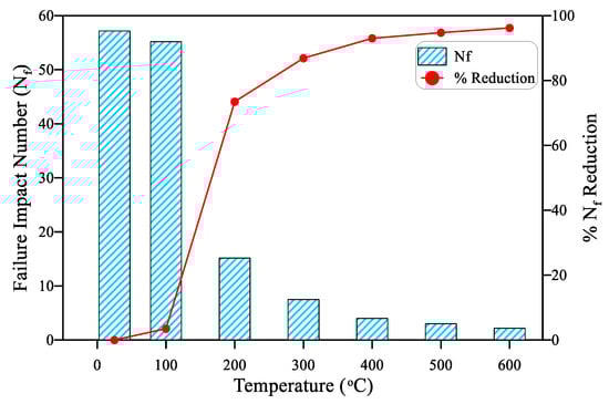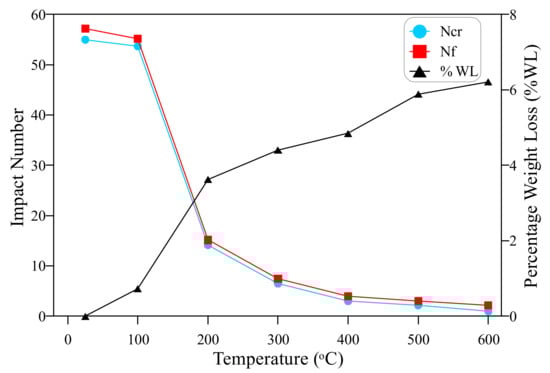 Figure 12 compares the behaviors of the residual impact strength in terms of the impact numbers of the disc specimens and the percentage weight loss of the same specimens. It can be said that the trend of the impact strength reduction is related to that of the percentage weight loss, where the same minor reduction is clear in the figure after exposure to 100 °C for both the strength and the weight loss, followed by a steep drop from 100 to 200 °C. After, a continuous decrease in the strength and an increase in weight loss are obvious from 300 to 600 °C. Indeed, the percentage strength is much higher than the percentage weight loss at each temperature; however, the behavior of the reduction with the temperature increase is quite similar.