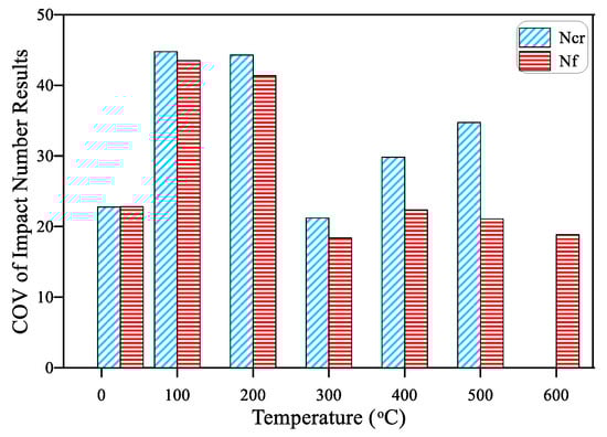Coefficient of variation of the cracking and failure impact numbers at different temperatures.