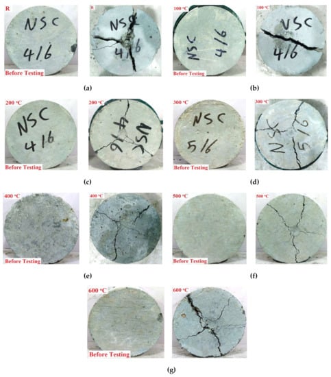 Figure 14b–d show that the specimens heated up to 300 °C exhibited a similar cracking and fracture behavior to that of the unheated specimens. However, at 200 and 300 °C, the cracking and failure tended to be softer, where the fracture started at much lower impact numbers, and the central fracture zone was smaller. The fracture of the specimens heated to temperatures above 400 °C is different. The material became so weak and absorbed the applied impact energy after being heated, where the cement paste became softer, the crushing strength of the aggregate particle reduced and the bond between them was almost lost. Due to these effects, internal thermal cracks were formed in the whole volume of the specimens. Therefore, for the specimens exposed to 400, 500 and 600 °C, only three impacts, two impacts and one impact were enough to cause the already existing cracks to appear at the surface. As a result, the central fracture zone was barely formed, and a higher number of major cracks (four or five) were formed accompanied by more hair cracks, as shown in Figure 14e–g.