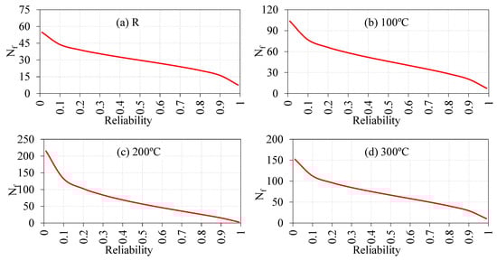 Table 3 demonstrates the results of the Weibull parameters obtained from three methods of distribution. It is clear from the table that the MSDM and MOM methods showed approximately the same parameter values. However, EPFM showed a lower value compared to MSDM and MOM. To perform the reliability analysis, the mean value of the three methods was used. The reliability of concrete exposed to various temperatures in terms of the failure impact number can be calculated using Equation (8) [94,95,96,97,98].
