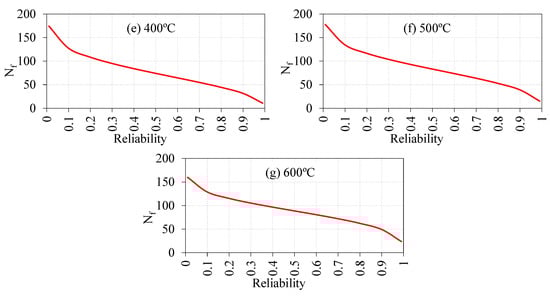 Failure number in terms of reliability (a) ambient temperature; (b): 100 °C; (c): 200 °C; (d) 300 °C; (e) 400 °C; (f) 500 °C; (g): 600 °C.